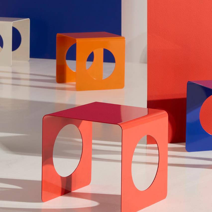 Geobau er et markant og farverigt indslag i vores kollektion, designet til at bringe energi til rummet med sin iøjnefaldende højglansfinish og legende, cirkulære udskæringer.