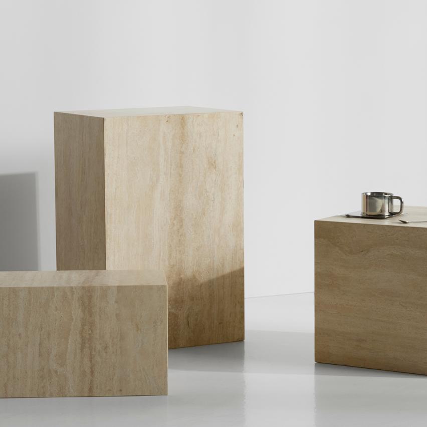 Travertina-bordet fås i tre størrelser og kan bruges alene eller i samspil med hinanden. Det kan vendes og placeres både stående og liggende – perfekt til minimalistiske eller moderne rum.
