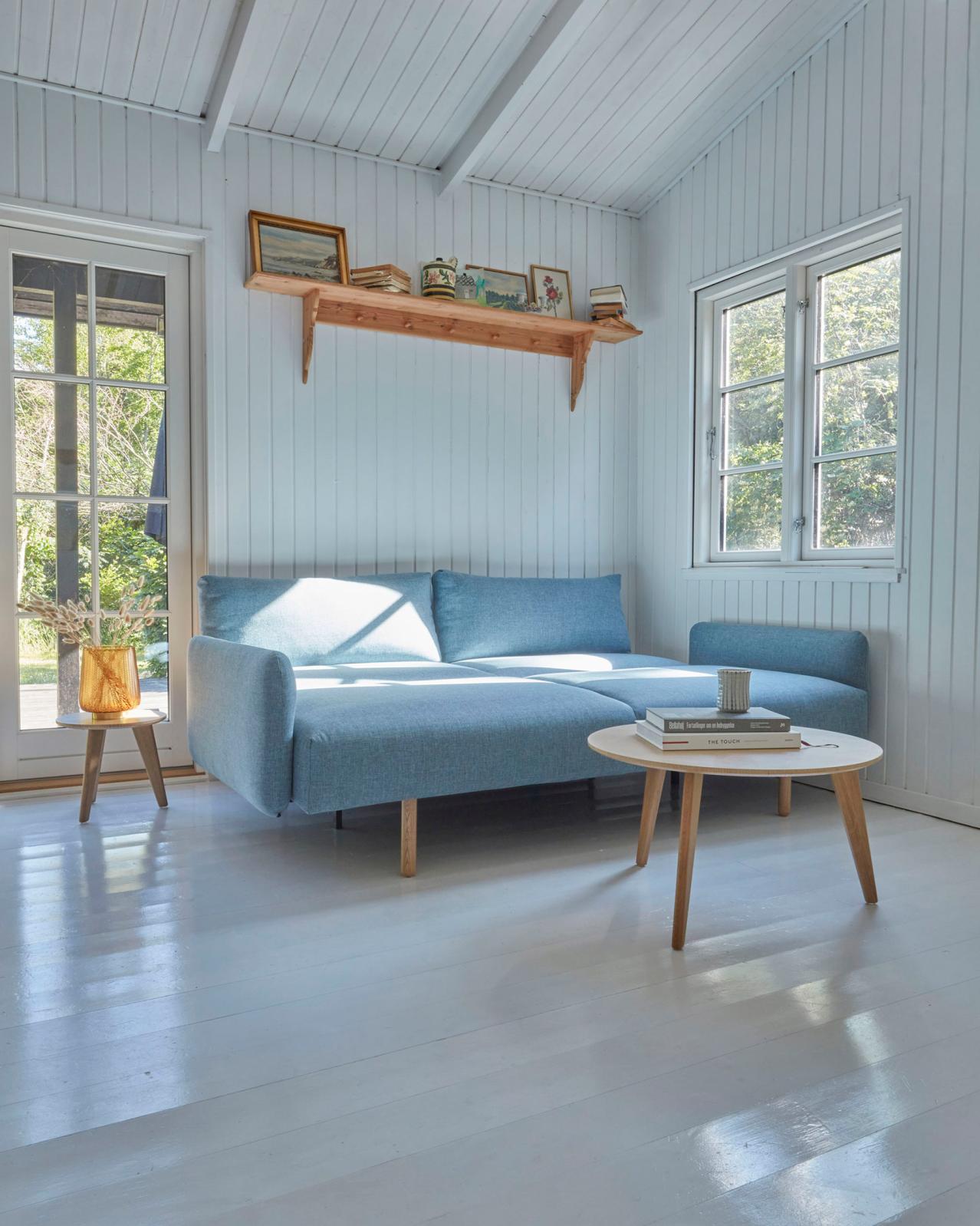 Ved at placere en multifunktionssofa i sommerhusets centrale rum, løser du samtidig mere end én brugssituation. Frode sovesofaen kan placeres frit i rummet primært som sofa eller seng. Placeret mod væggen med rygpuderne mod væggen, har du et loungeområde nok til at rumme hele familien.